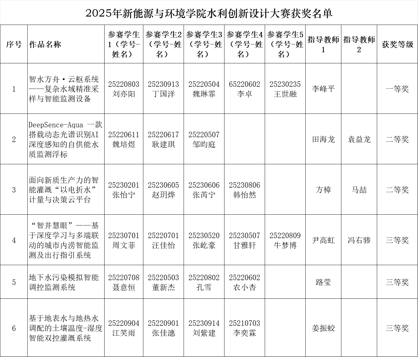 根据《关于举办第九届全国大学生水利创新设计大赛的通知》(水教协[2025]8号)要求,百合漫画 于2025年5月8日组织了水利创新设计大赛院赛,对本次申报的6个作品进行了评审,确立一等奖1项,二等奖2项,三等奖3项,确定推荐《智水方舟·云枢系统——复杂水域精准采样与智能监测设备》、《DeepSence-Aqua 一款搭载动态光谱识别AI深度感知的自供能水质监测浮标》、《面向新质生产力的智能灌溉“以电折水”计量与决策云平台》三个作品参加国赛,现予公示。