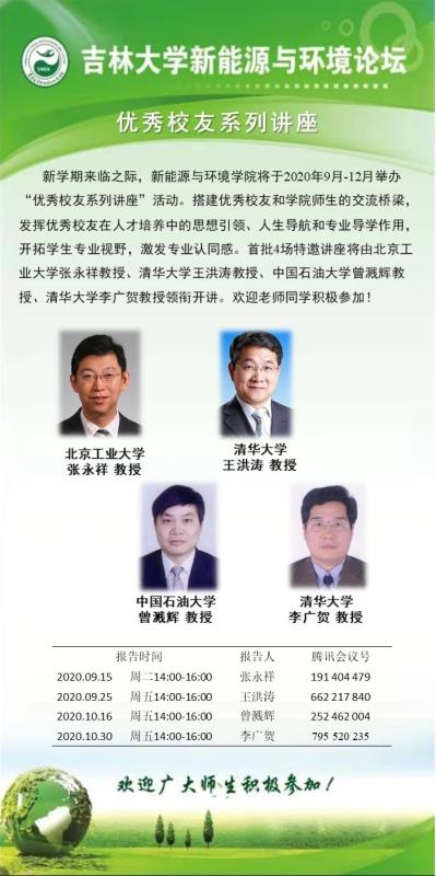 新学期来临之际,我院将于2020年9月—12月举办“优秀校友系列讲座”活动。搭建优秀校友和学院师生的交流桥梁,发挥优秀校友在人才培养中的思想引领、人生导航和专业导学作用,开拓学生专业视野,激发专业认同感。首批4场特邀讲座将由北京工业大学张永祥教授、清华大学王洪涛教授、中国石油大学曾溅辉教授、清华大学李广贺教授领衔开讲。欢迎老师同学积极参加!