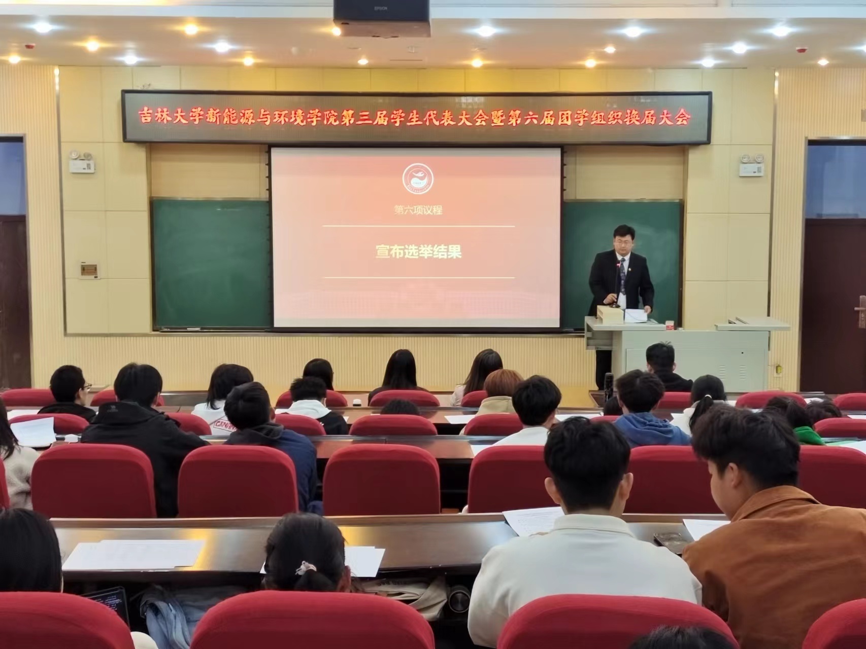 第三届学生代表大会暨第六届团学组织换届大会于2023年10月18日晚19:00在前卫北区理化楼第一阶梯教室举行。学院党委副书记兼副院长吴哲老师、学院学生工作办公室全体辅导员、第五届团学组织主席团成员、各年级正式代表出席了本次会议。会议由团委负责人母茂松老师主持。