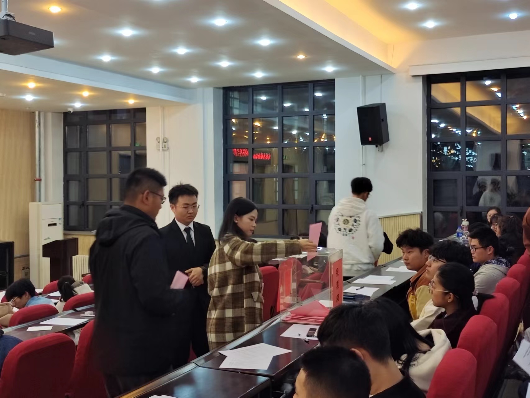 在学院党委副书记兼副院长吴哲老师为第五届团学组织主要学生干部颁发聘书后,由第六届团学组织主要干部候选人依次上台进行三分钟竞选演讲。与会评委针对竞选者发言内容进行提问。竞选演讲结束后,与会代表进行民主表决,投票过程秉承公平、公正的原则,计票人在监票人的监督下进行计票,并将得票结果现场公布。