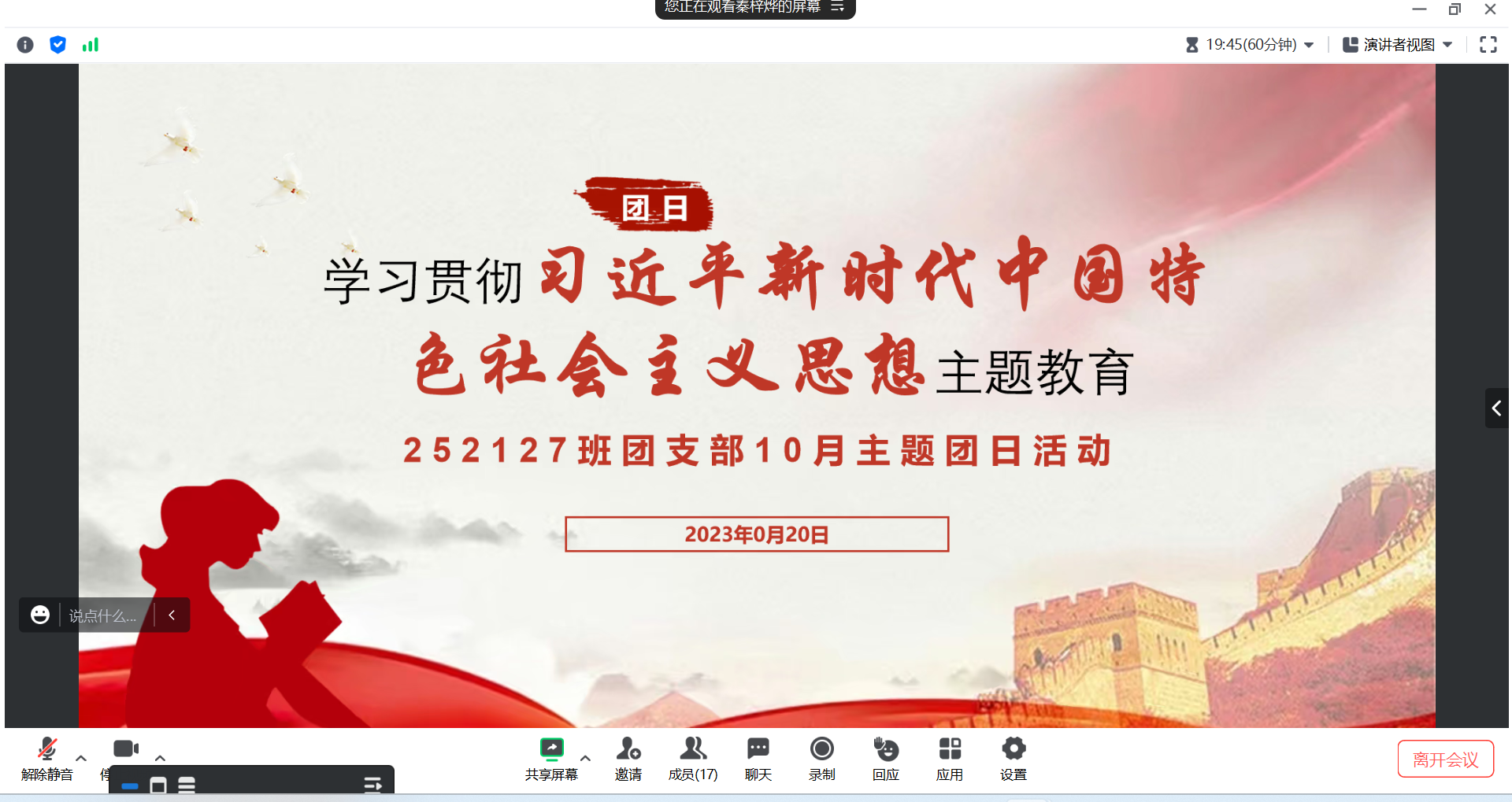 252127班团支部积极响应共青团中央《关于面向广大团员和青年开展学习贯彻习近平新时代中国特色社会主义思想主题教育的通知》,开展学习贯彻习近平新时代中国特色社会主义思想主题教育暨10月团日活动。会议由团支书秦梓烨同学主持,班级全体团员与青年同学参加会议。