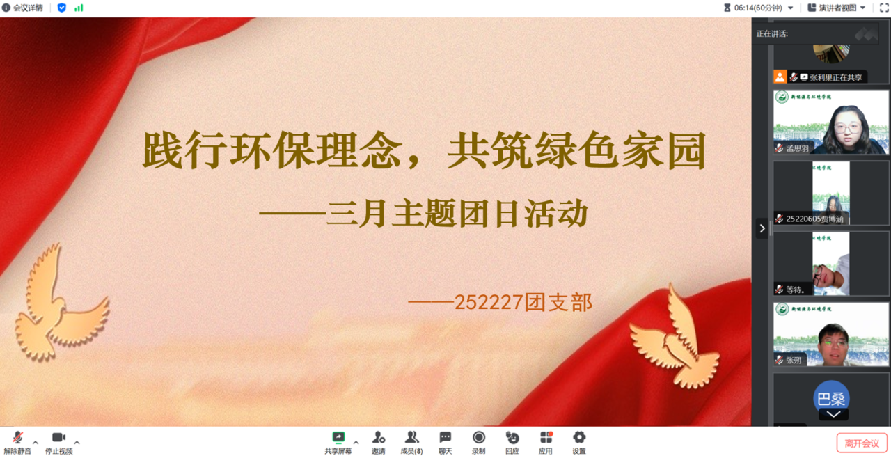 252326团支部向大家展示了环保宣传片《带着地球去远方》,以及生动的画面和引人深思的内容,深入浅出地讲解了垃圾分类的重要性、减少塑料使用的方法以及节能减排的具体措施。