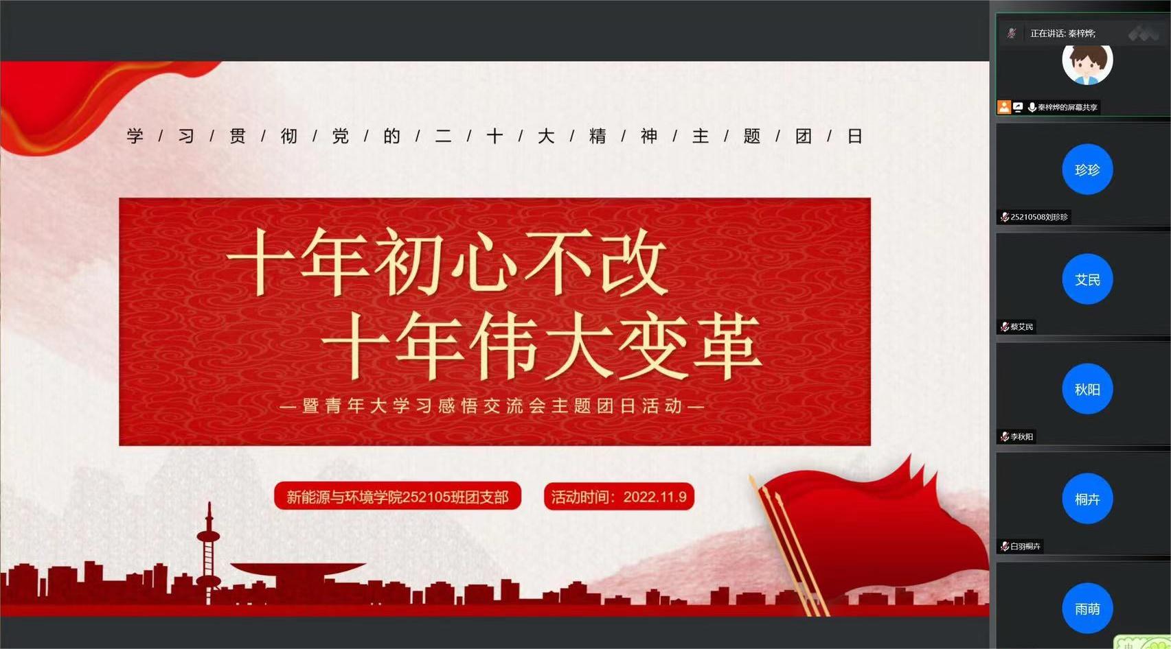 252105班团支部在线上开展了主题为“十年初心不改,十年伟大变革”的团日活动。会议由团支书秦梓烨同学主持。