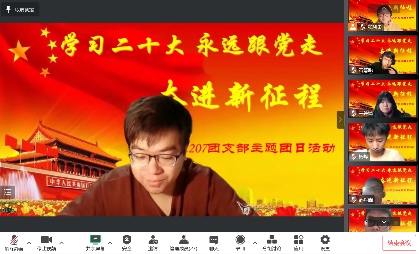 252207班团支部于11月26日晚七点在团支书张利果的带领下开展“学习二十大 永远跟党走 奋进新征程”暨青年大学习感悟交流会主题团日活动。此次活动共有包括团支部内24名共青团员在内的27位青年参加。