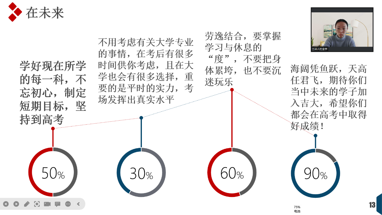 的相关资料,并提前找到熟识的老师收集中学生关心的问题,以便更好地解决同学们的疑惑。准备完宣讲的内容之后,我联系学校的有关领导和老师,并认真听取他们的指导和建议,决定举行线上宣讲活动。前期准备活动节省了母校时间、空间资源,节约了同学们的精力,也提高了同学们参与活动的热情。