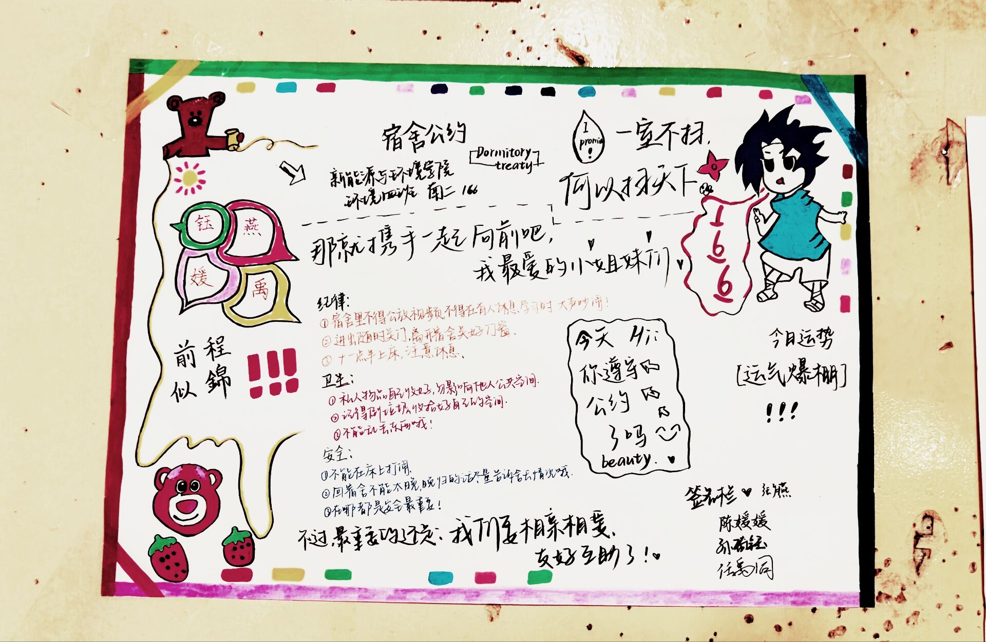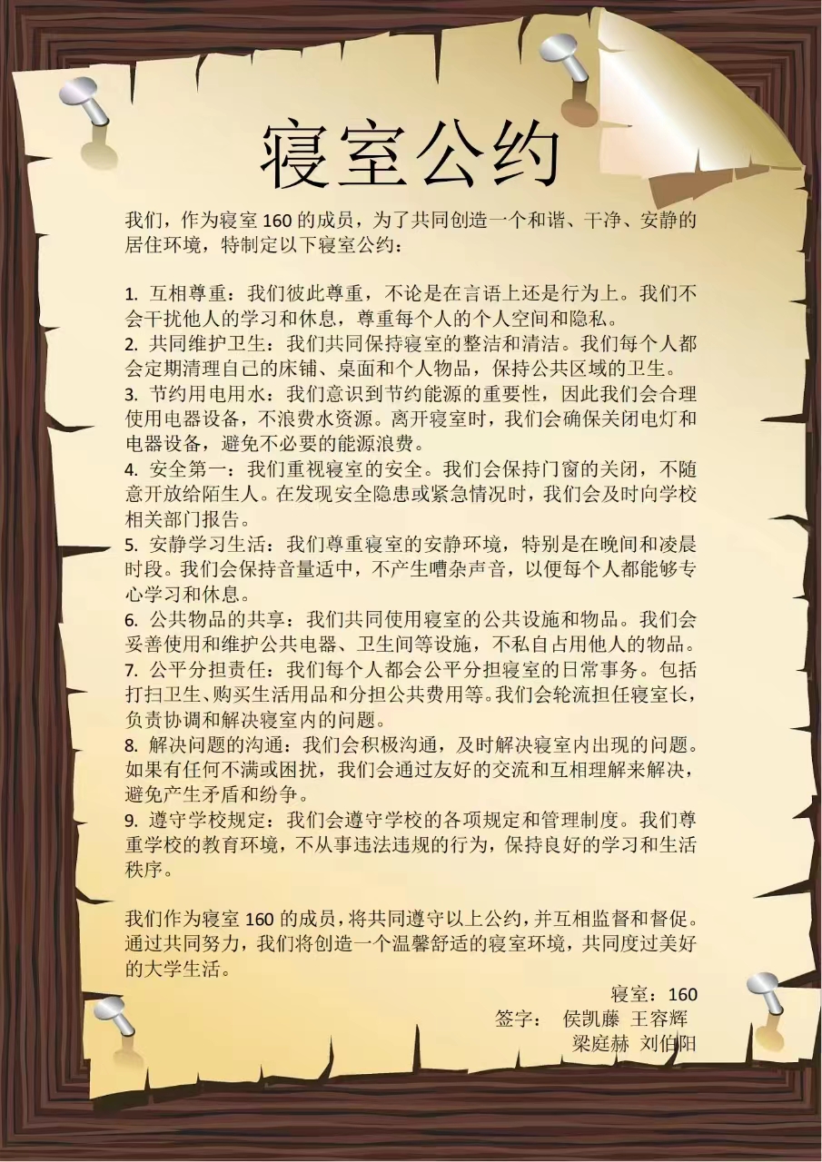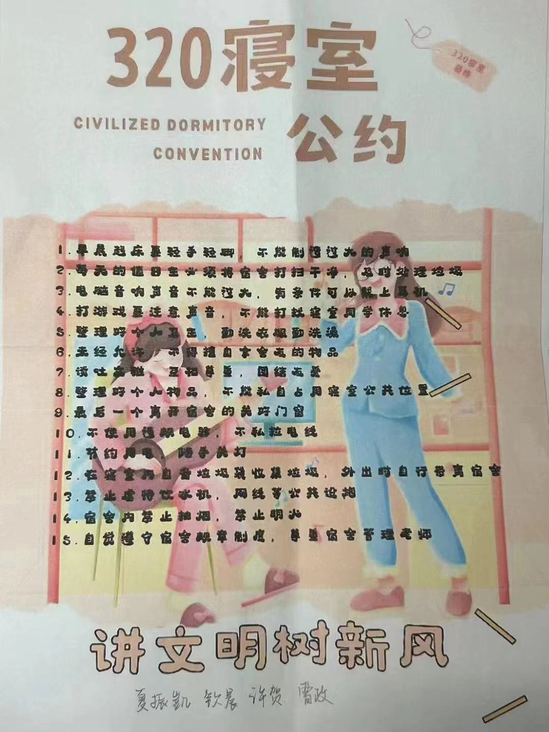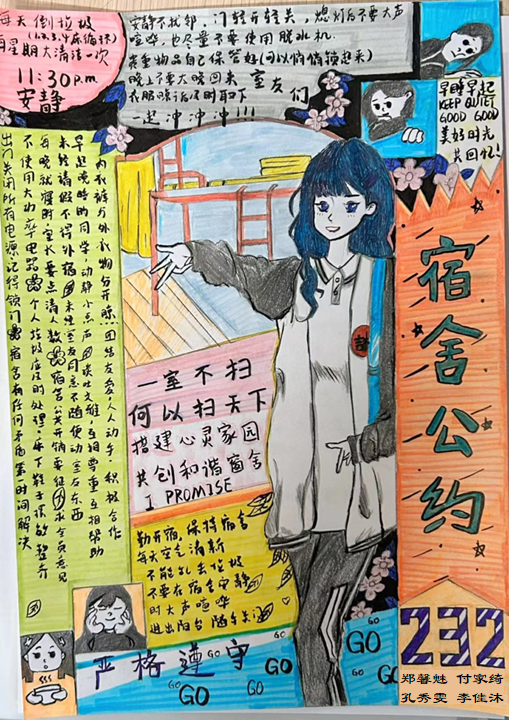 为进一步加强公寓文化建设,发挥公寓育人阵地作用,推动学生寝室制度化、有序化管理,引导学生养成良好的生活习惯,营造文明和谐、干净整洁的寝室文化氛围,百合漫画 面向全体2023级本科生举办寝室公约创建活动,以多种多样的形式围绕宿舍卫生、校规校纪、学习氛围、作息时间等方面进行设计,涌现出一大批优秀的寝室公约。(以下排名不分先后)