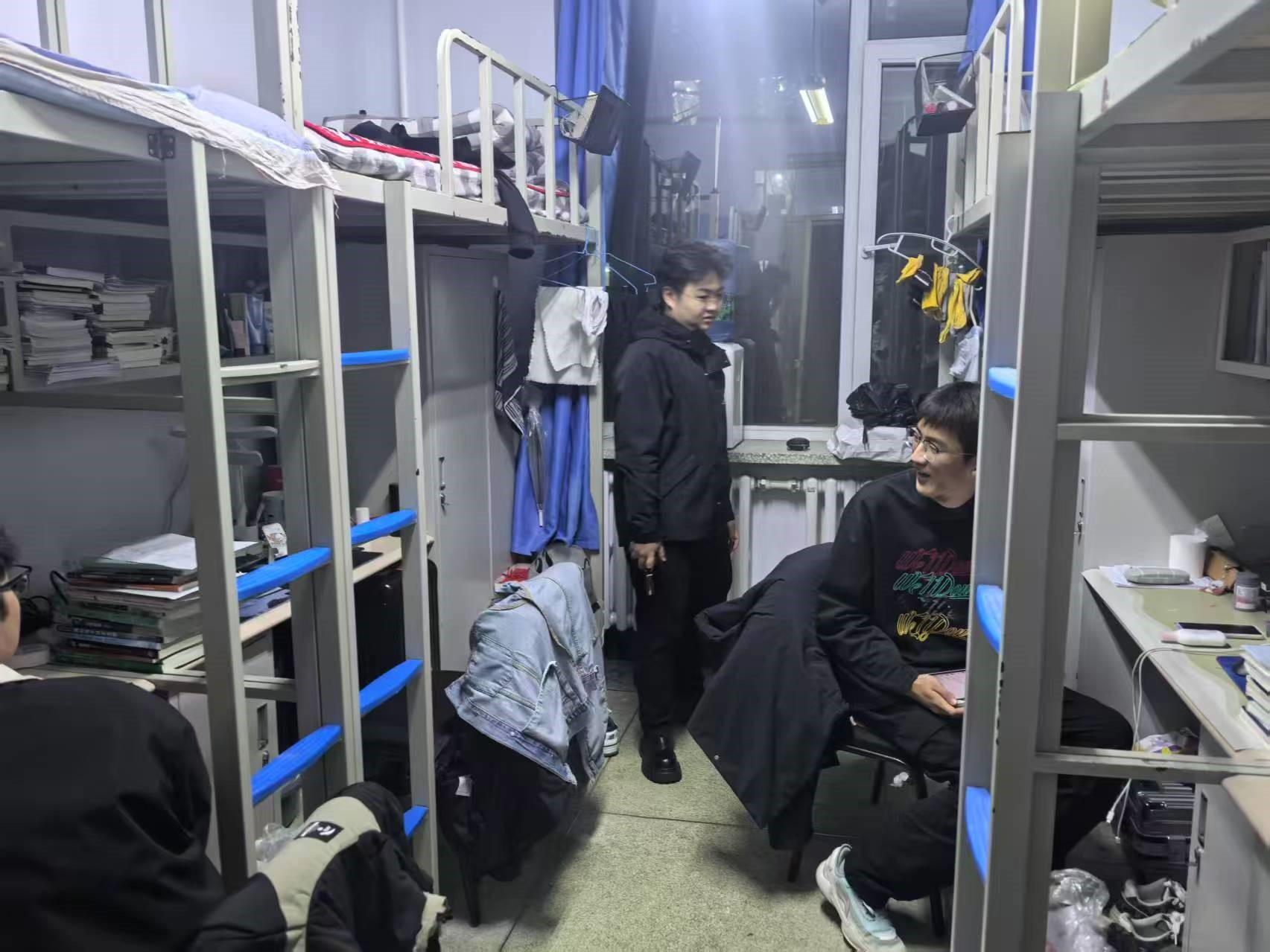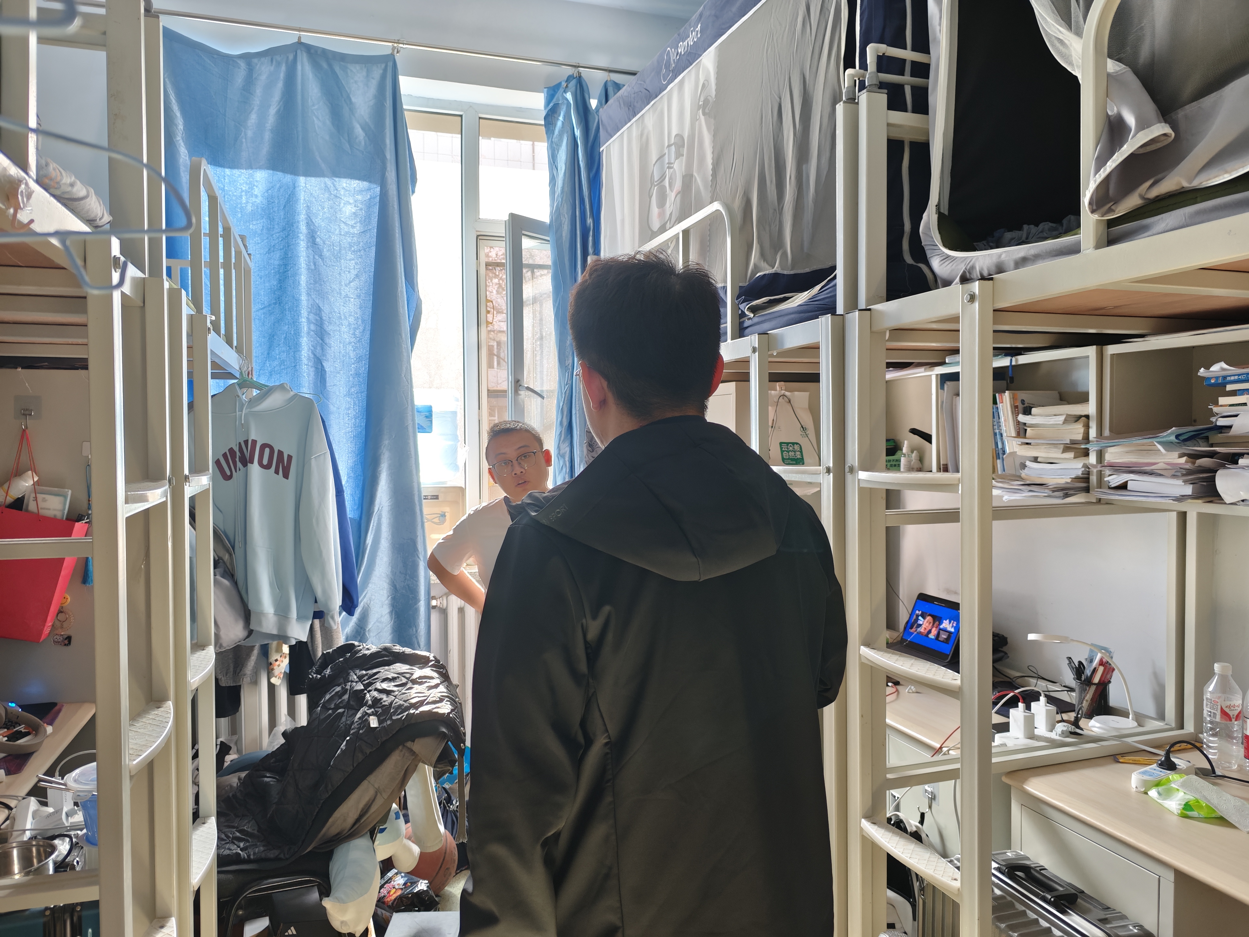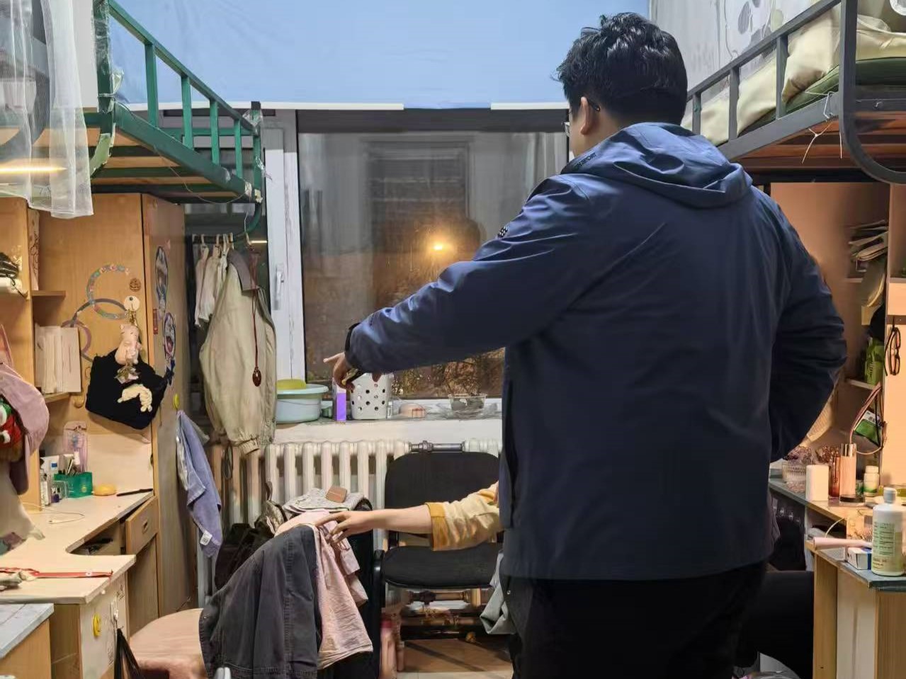 4月18日,2024级新生辅导员助理姜兆轩进入南苑一公寓学生寝室,检查公寓卫生及消防安全情况,同时查看转专业学生寝室调整情况,确保转入学生均已完成寝室调整。