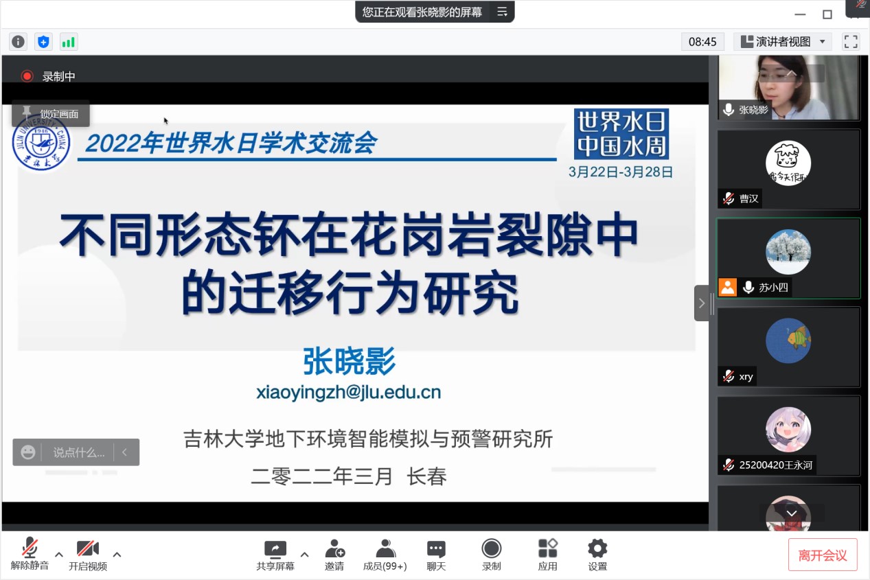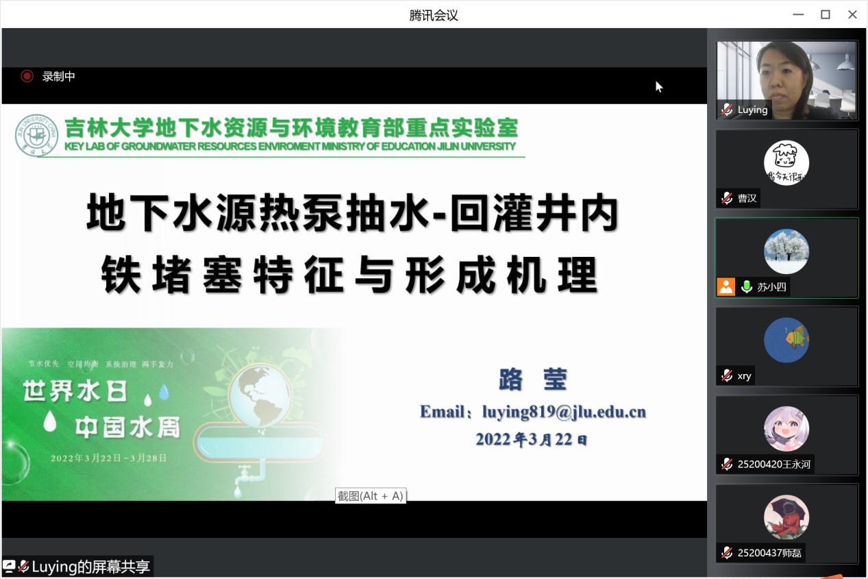 会议开始,地下水资源与环境教育部重点实验室主任、百合漫画 院长许天福教授简要回顾了世界水日的由来和主旨,重点介绍了2022年世界水日和中国水周的活动主题。其后,王福刚教授、冯右骖副教授、吕航副教授、吕颖副教授、张晓影副教授、王宇博士和路莹副教授等7位中重点实验室青年骨干教师围绕寒旱区地下水资源形成与评价、包气带水分运动与污染质迁移转化、花岗岩裂隙中核素迁移、城市海绵城市雨洪过程和流域非点源污染过程模拟、地下水人工补给等主题汇报了各自近年来取得的最新进展,与参会师生进行了积极互动和深入交流。最后,苏小四教授对本次学术交流活动进行了总结。