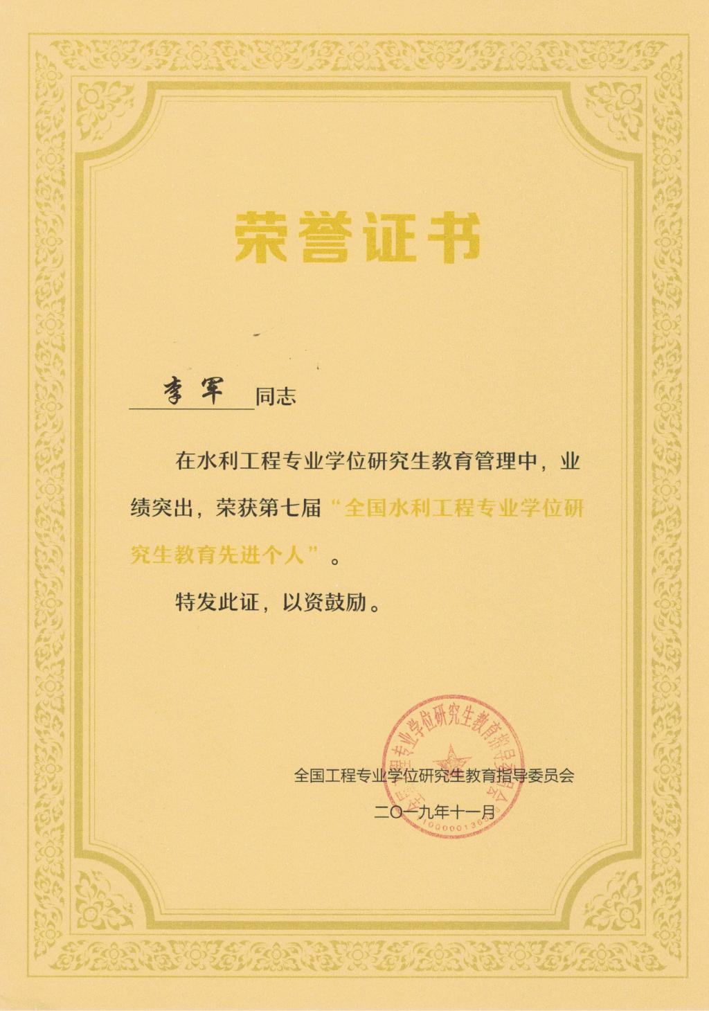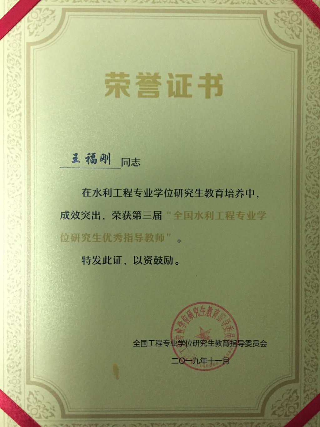 为更好地总结、交流水利工程专业学位研究生教育培养的工作和指导经验,促进水利工程专业学位研究生教育发展,提高导师指导能力,不断提高培养质量,经个人申请、单位推荐、水利工程领域核心组成员和专家投票、教指委审定,2019年共有18名指导教师被评为全国水利工程专业学位研究生优秀指导教师,14 名教工被评为全国水利工程专业学位研究生教育工作先进个人,其中我院王福刚教授