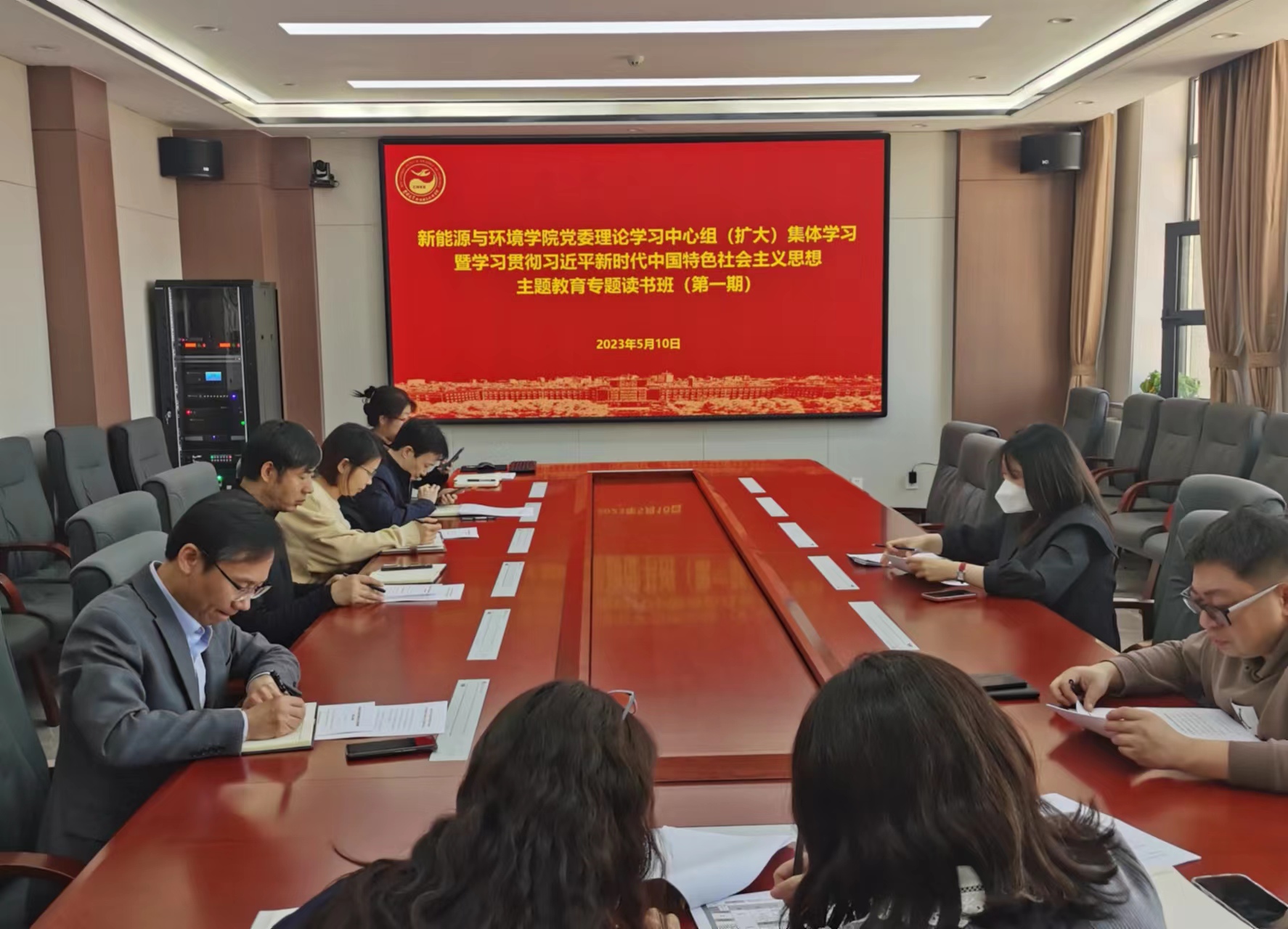 在北区理化楼540会议室,召开党委理论学习中心组(扩大)集体学习暨学习贯彻习近平新时代中国特色社会主义思想主题教育专题读书班(第一期),学院党委理论中心组成员、教工支部书记、科级干部参加了会议。会议由学院党委副书记温卓主持。