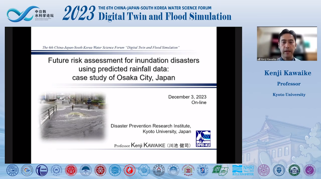 论坛首先由院长许天福教授致欢迎词,王浩院士作为学术委员会主席阐述了中日韩科学家开展深入交流和探讨的重要意义,指出“中日韩三国同属季风气候区,降雨时空分布不均,汛期雨量集中,长期遭受严重洪涝灾害,近年来,在气候变化影响下,极端暴雨频发,洪涝灾害加剧,进一步加强数字孪生与洪涝模拟相关科学研究十分必要”。王院士希望各国科学家贡献智慧、互学互鉴、促进交流、加强合作,为建设美好、宜居的地球家园和构建人类命运共同体贡献科技力量。线下会议由李鸿雁教授主持,线上会议由冯右骖副教授主持。