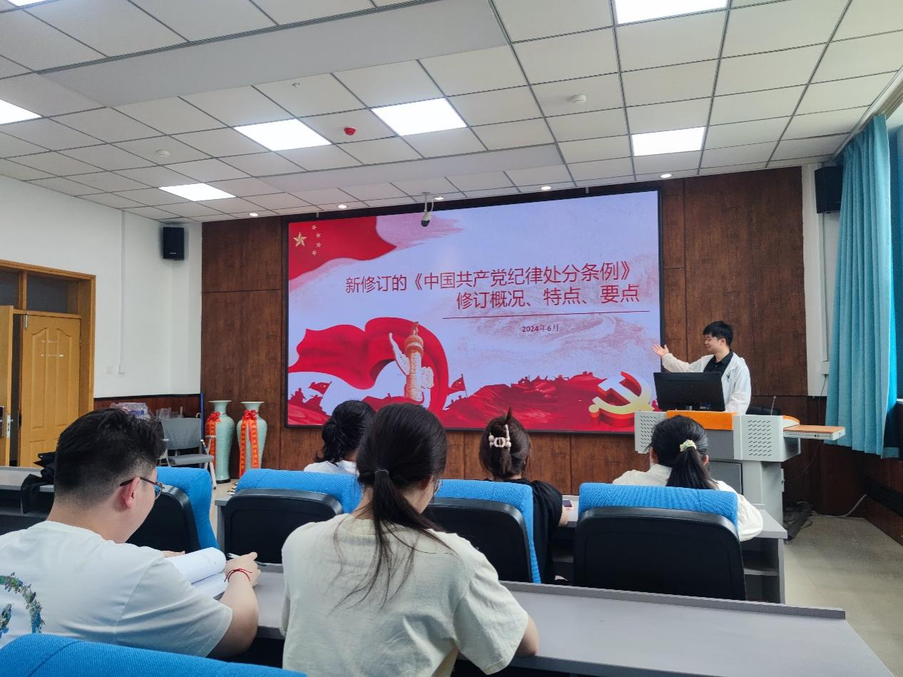 本科学生第二党支部全体党员在支部书记母茂松的带领下,围绕《中国共产党纪律处分条例》开展了学习。通过学习,支部全体党员深刻认识到党纪国法的严肃性和重要性,明确了作为党员应当遵循的行为准则和道德底线。广大党员要提高政治站位,增强学习主动性,树立规矩意识。同时对于即将毕业、走向工作学习岗位的毕业生党员提出“干干净净为国家和人民工作,为中国式现代化建设贡献青春力量”的要求与期待。