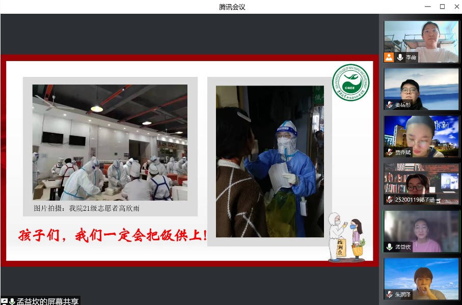 活动伊始,党支部组织委员兼宣传委员牛梦圆同学带领大家一起学习了《致全省各级党组织和广大共产党员的一封信》以及《致全校各级党组织和广大党员的倡议书》。随后,四位党员志愿者代表分别分享了自己的战疫故事。孟益坎同学向大家展示了几组图片,讲述了自己从看到老师同学们积极参与疫情防控到自己和室友们一起参与防控的故事,分享了自己在清晨为大家发放完早餐后获得的自豪和光荣。她用“聚是一团火,散是满天星”形容一直奋战在校园疫情防控第一线的志愿者。一直驻校工作的钟宇博老师也分享了他这段时间的工作感受,他最后说“我们终会在春暖花开的校园里,迎接百合漫画